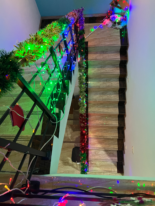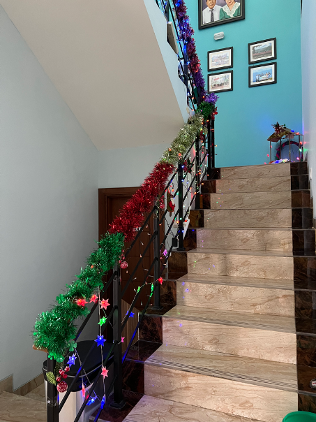 Mulai dari menaiki tangga menuju lantai 2, sudah dihiasi ornament Natal